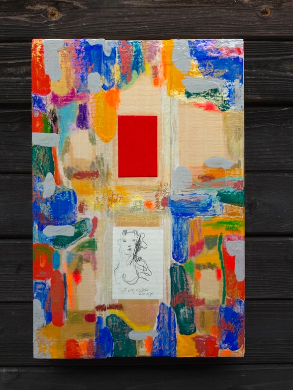 古井戸芳生の“木”。偏に“木”と言っても、その重厚感から、それがかつて偉大な巨木であったことを物語る。この木が植物として地球上に誕生し、樹木として存在し続けた年月は計り知れなく、美術作品として形を変容させた今でも、その風貌と佇まいから感じられる凄みは決して失われていない。破片として《あつみのある絵画 森の精》という作品の支持体となった“木”の素材は、樹齢200〜300年の天然木曽ヒノキであるとのことだ。破片といっても生命の脱け殻などではなく、巨木を、森の繁茂をイメージさせるだけの霊的なエネルギーを宿し続けている気がする。その存在はもはや「絵画にとっての支持体」であるという簡易的な美術用語の領域を超越し、現代において作品として生まれ変わった物体の本体であり、古井戸の表現を纏う核を成す。そして古井戸芸術が次々に創造され現実世界に生み出されていく根源、ようするに「母体」のようなものなのだろう。そのような“母体”に対してペインティングという行為で向き合う古井戸はどのような気持ちで素材と相対しているのか。気になるところである。